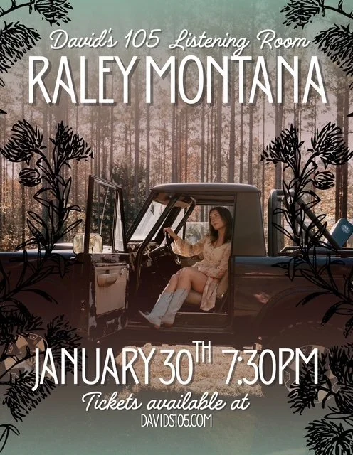 Raley Montana returns for an intimate, seated performance at David’s 105. An emerging country artist from middle Georgia, she is known for heartfelt lyrics, soulful vocals, and a sound that blends traditional and modern country.